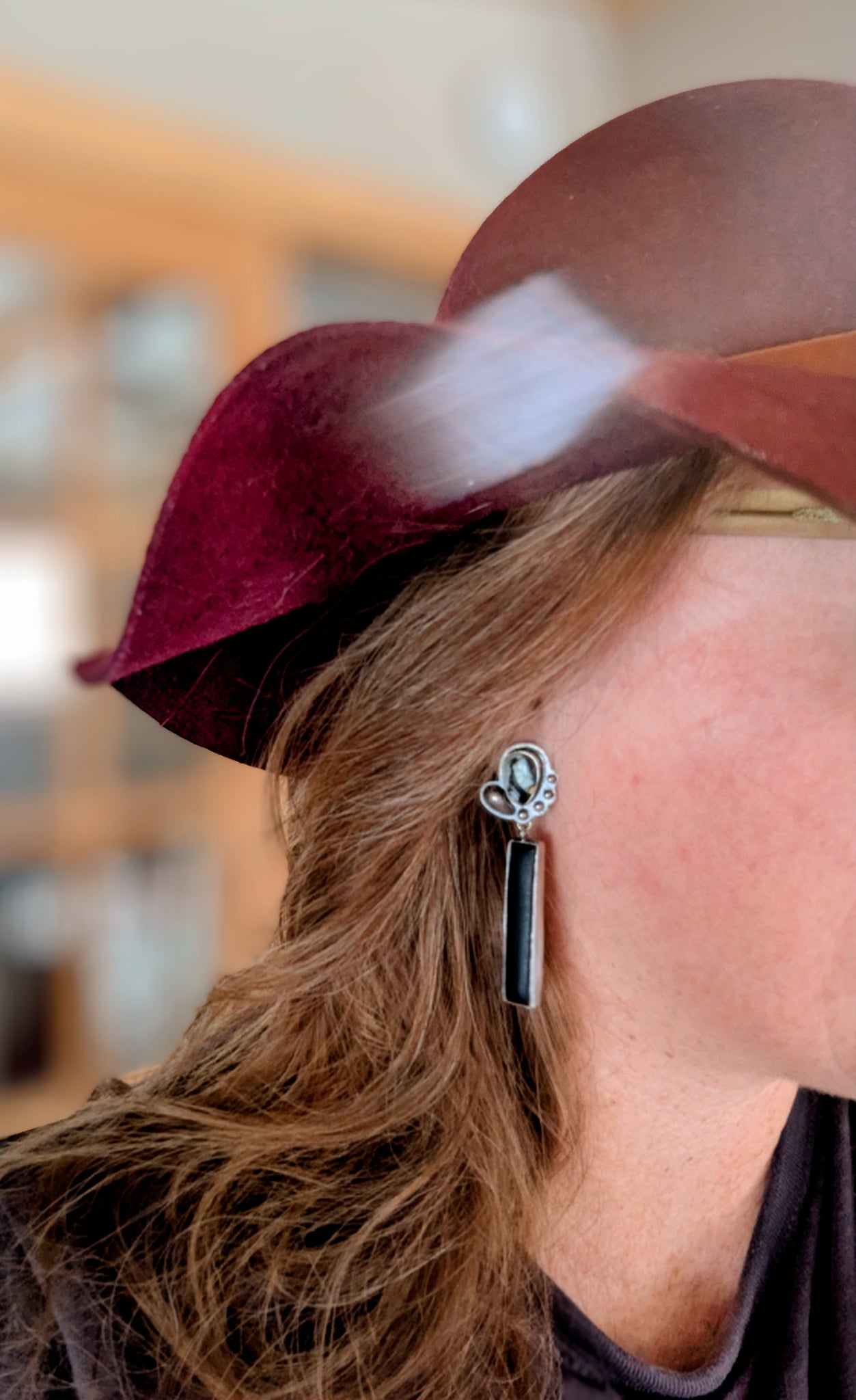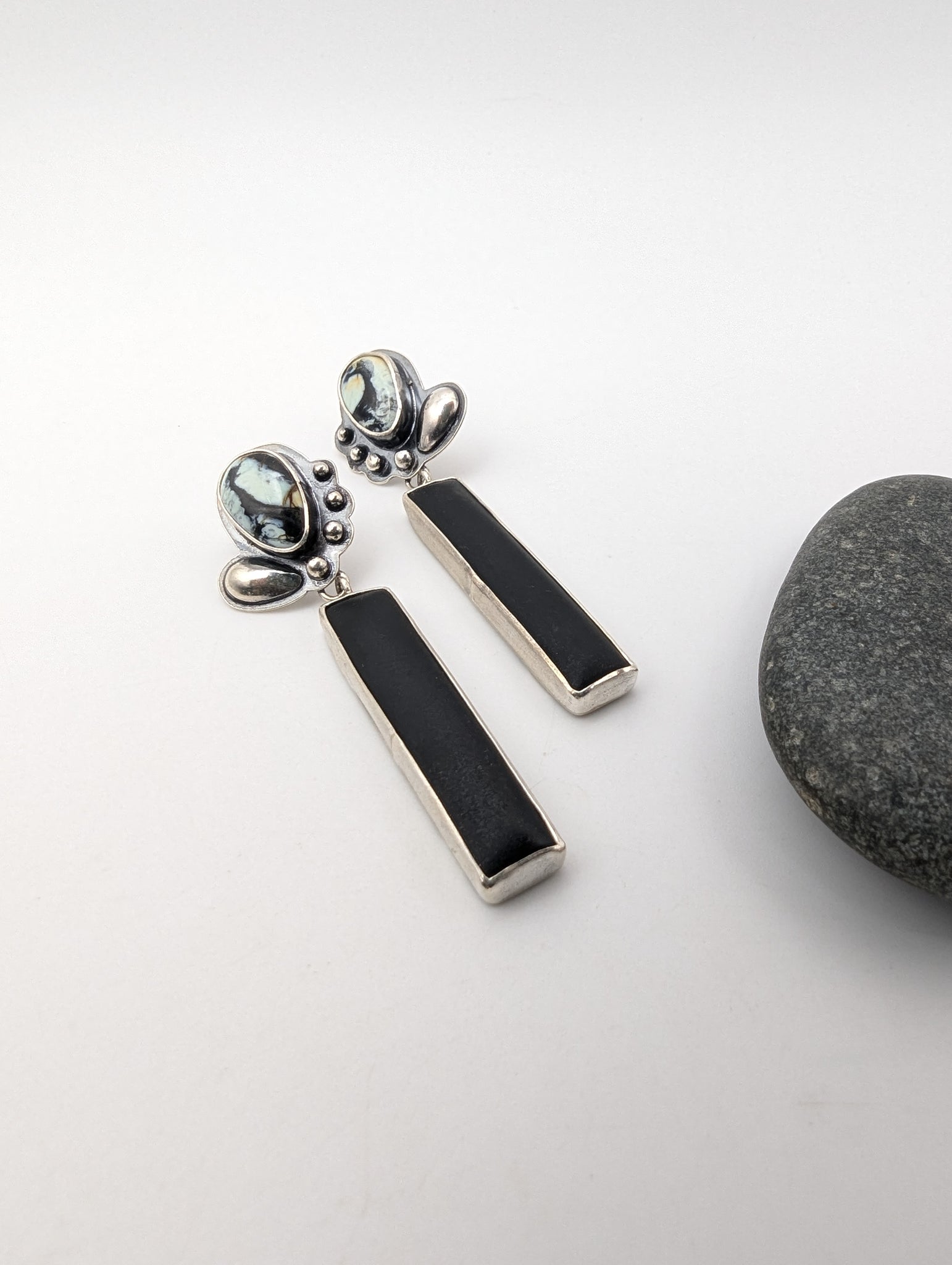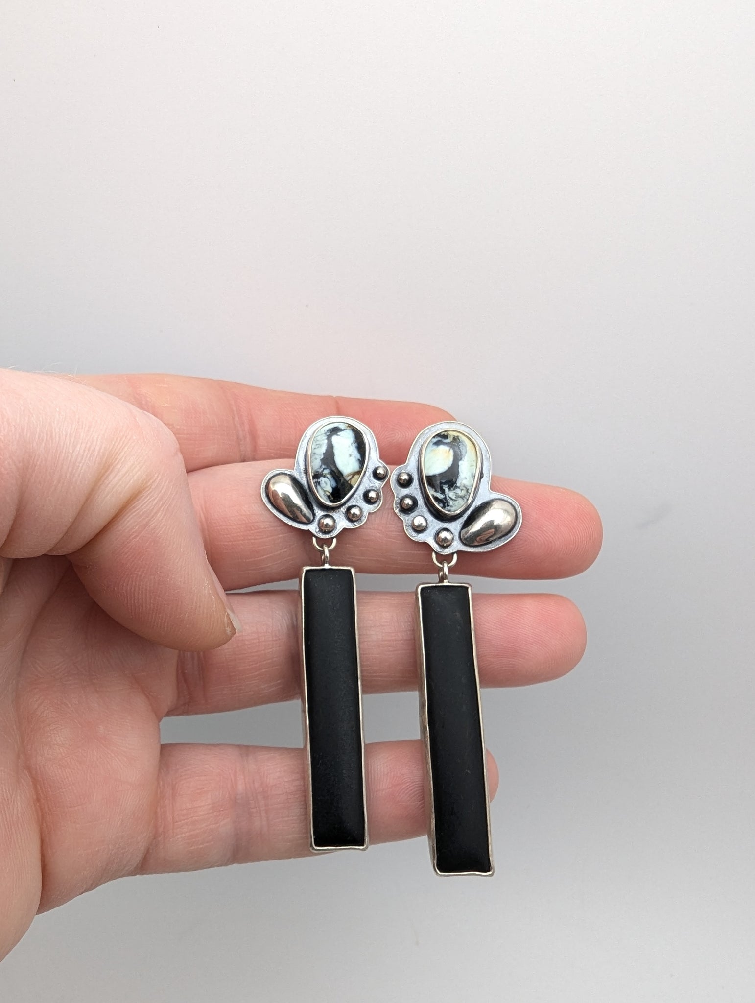 Bold yet grounded, these statement earrings feature striking variscite stones paired with a sleek matte black finish for a modern, earthy contrast. Designed with post backs for comfortable wear, they’re finished with small sterling silver accent beads that add just the right touch of shimmer - these earrings are made to elevate any look with quiet confidence.