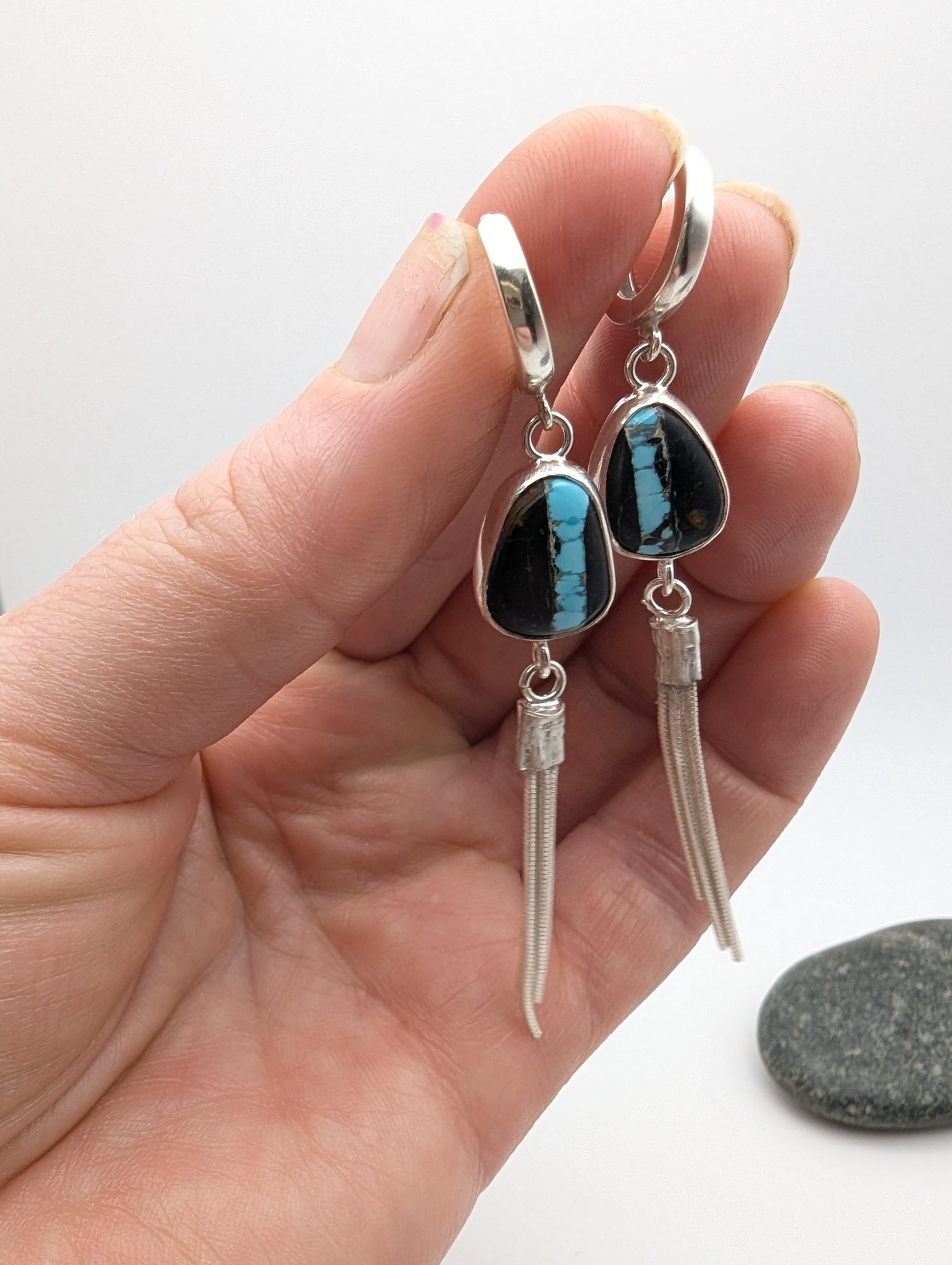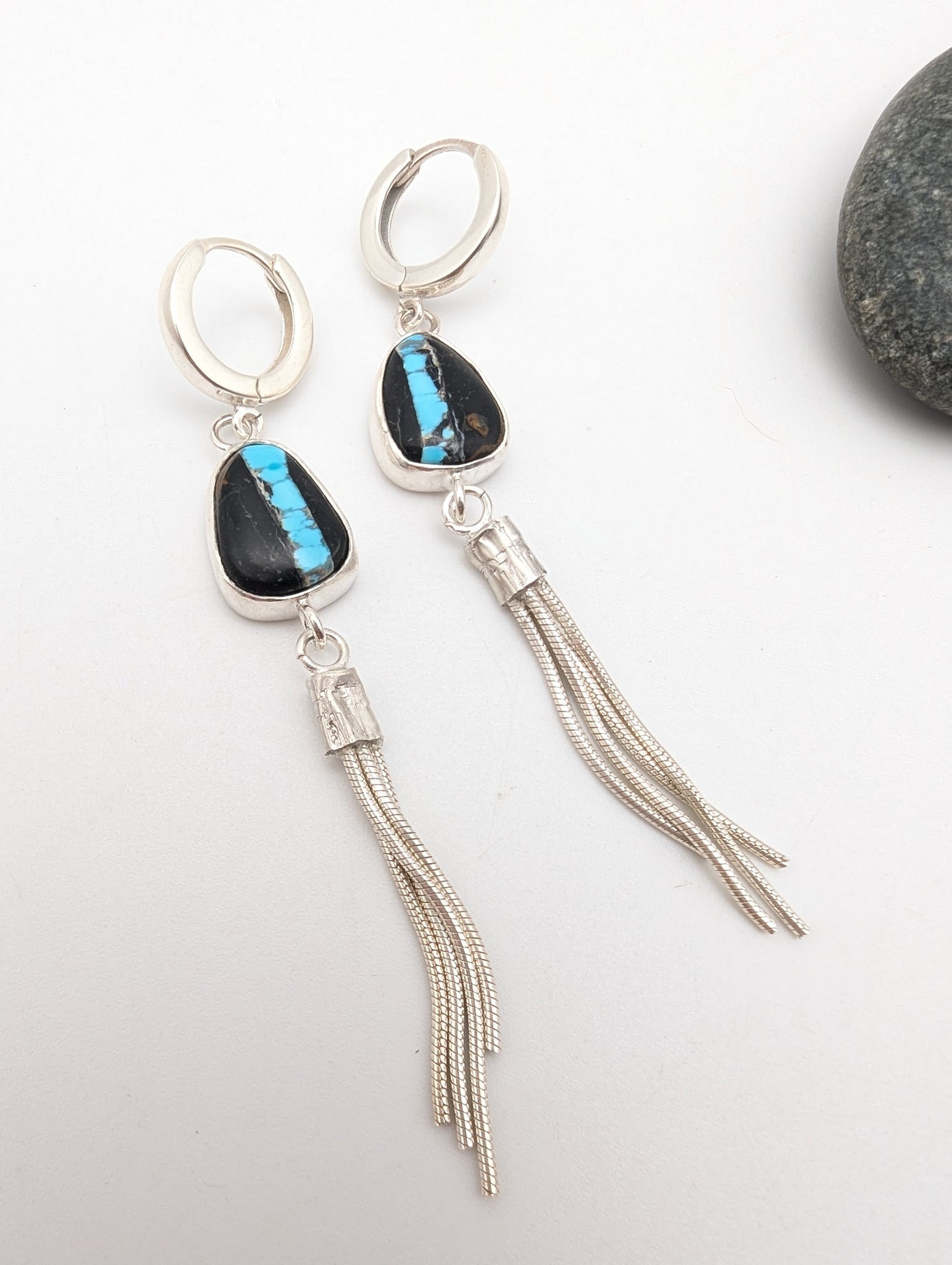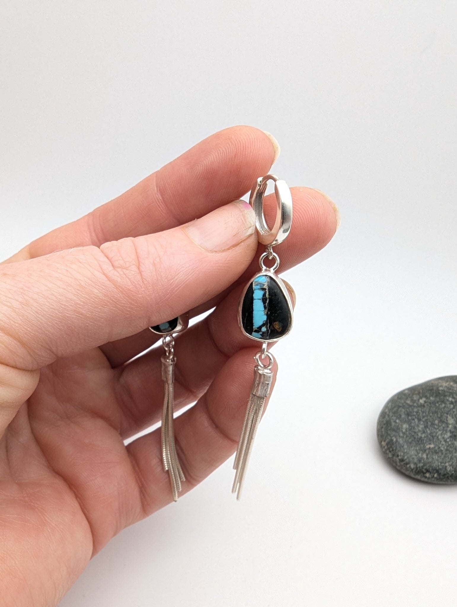 • Rugged yet refined, these huggie hoops carry 1.5" sterling silver tassels that sway with every step, finished with the bold blues of Blackjack Turquoise.