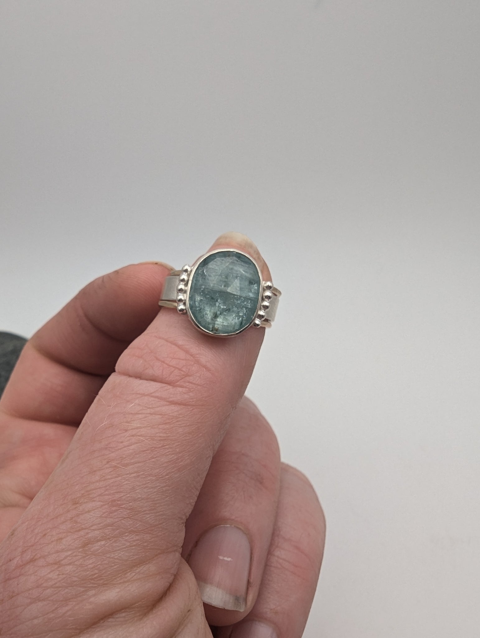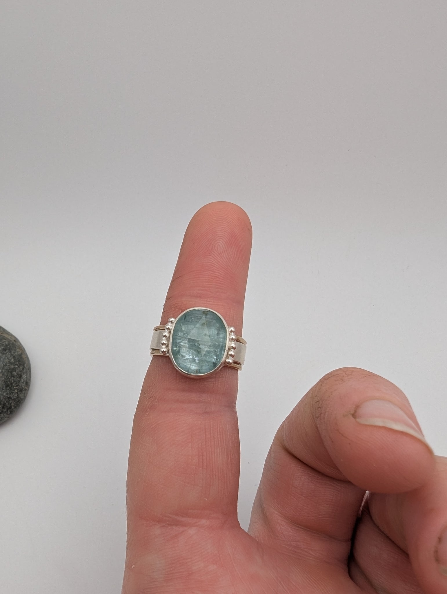 - This Aqua Kyanite Ring is a dreamy balance of soft ocean hues and golden warmth. The natural stone holds a subtle shimmer, with shades that shift between seafoam and sky depending on the light. It's wrapped in sterling silver and paired with two 14/20 gold-fill stacking bands that bring out the warm undertones in the kyanite—like sunlight catching waves at just the right angle. Wear them together for an effortless mixed-metal look, or separate them out to suit your mood. A set that’s equal parts earthy, elegant, and everyday magic.